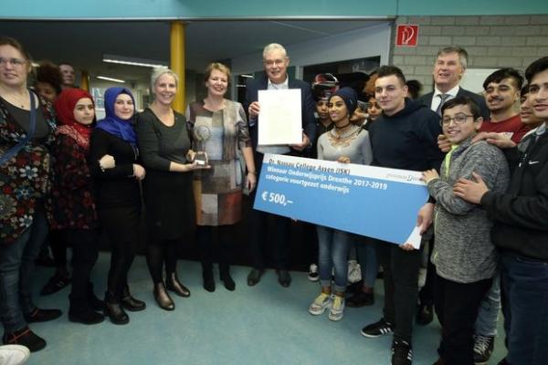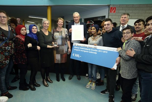 De Internationale Schakelklas (ISK) van het Dr. Nassau College in Assen heeft vrijdag 8 februari uit handen van Drents Gedeputeerde Cees Bijl de Onderwijsprijs Drenthe 2017-2019 ontvangen. Zie over dit project ook artikelen in Les 207.